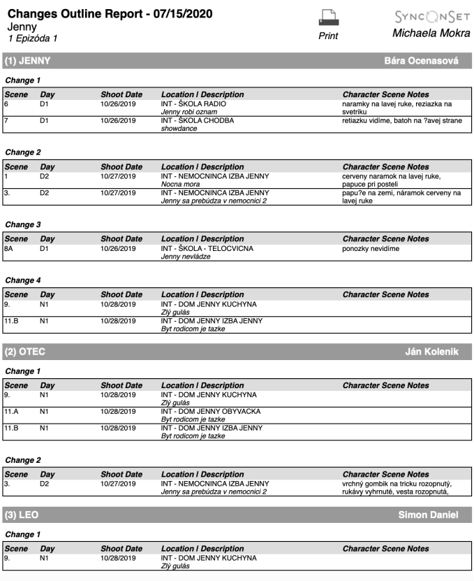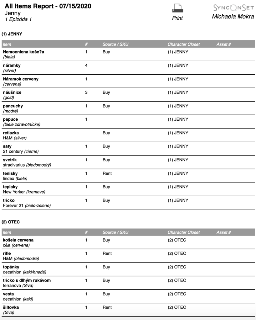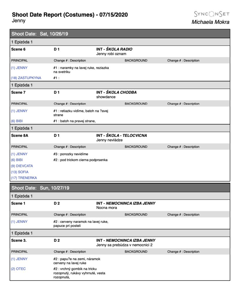 Pri správnom nahadzovaní údajov si viete ľahko pripraviť rôzne zoznamy (reporty): napríklad veľkostné tabuľky hercov, zoznamy kostýmov na nakupovanie, na vrátenie do požičovne, budget pre produkciu a kostýmovú prípravu na nasledujúci natáčaní deň pre kostymérky.