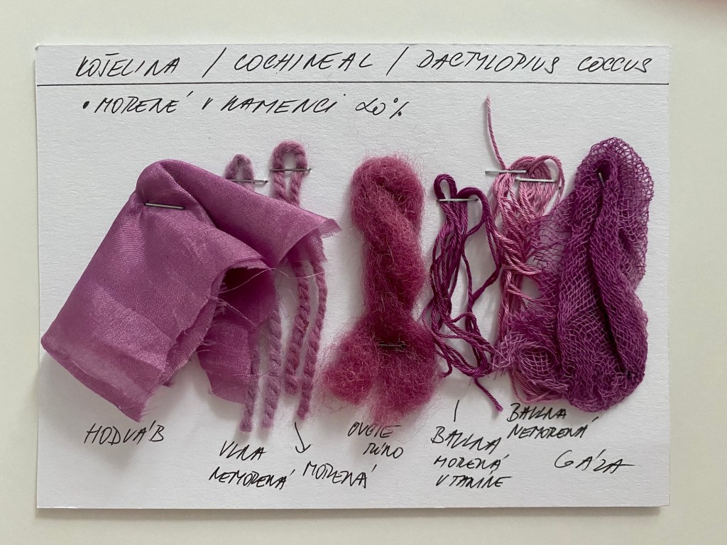 Košenila – karmínové farbivo sa získava zo suchého chrobáčika – červca nopálového, parazita živiaceho sa na sukulentoch Opuncie. Farbivo pochádza zo strednej Ameriky, používali ho vo veľkom Aztékovia a Inkovia a do Európy ho doniesli Španieli, pričom popri zlate a striebre predstavovalo obrovský zdroj bohatstva. Žiarivo červená, ktorá sa dá farbením získať, je tiež extrémne svetlostála. Okrem farbenia látok ( červené rúcha kardinálov, červené kabáty britskej armády atď) sa používalo aj ako farbivo do make-upu a dodnes sa používa aj v potravinárstve ako E120. Na kurze sme používali na morenie kamenec, takže farba nám vyšla fialová, ale na dosiahnutie žiarivo červenej sa používa napr. vínny kameň.