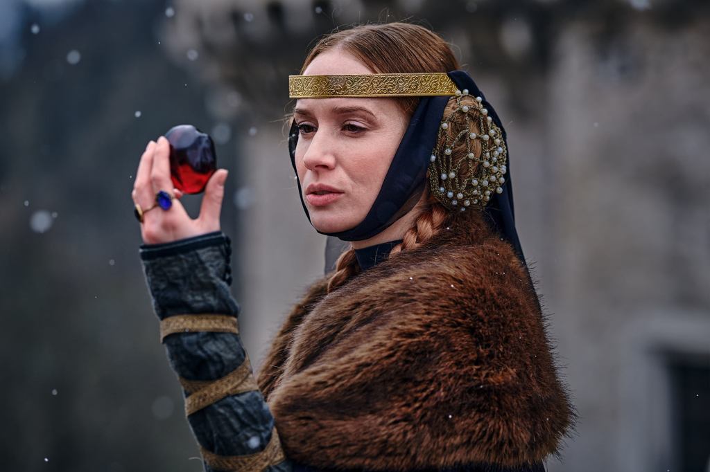 HT: Zásadná farba tohto filmu je červená. Celé kráľovstvo sa nesie v duchu tejto farby. Varkoče zbrojnošov, čabraky ich koní, či kráľovná, ktorá si oblečie červené šaty. Červená je milovaná farba kráľovny. Totálne podľahne čaru červeného rubínu, ktorým ozdobí svoju kráľovskú korunu. Aby sme umocnili toto gesto, zakázali sme si vkladať červenú farbu do akýchkoľvek iných šperkov. Ďaľej som s obľubou používala farbu zlatú. Rada totiž pracujem so šperkami, čo Mariana úplne podporovala. Chcela, aby kráľ aj kráľovná boli naozaj honosní, aby z nich zlato doslova odpadávalo.