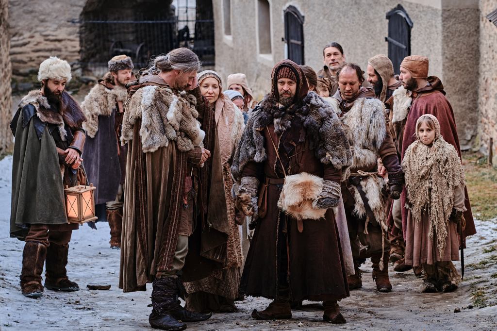 HT: Nebol čas na nejakú veľkovýrobu kostýmov, zato všetky kostýmy hlavných postáv prešli úpravami. Kostýmy som rôzne kombinovala z fundusov, čerpala som z Barrandova, RTVS, Peris Costumes a MAFILM v Budapešti. Kombináciou vecí som vytvárala charaktery a všetky požičané kostýmy sme ďalej rôzne prešívali, doplňovali a zdobili. Našívali sme kožušiny, farbili sme, zlatili a veľa patinovali. Potom sme to samozrejme museli všetko vrátiť v pôvodnom stave. Na tom sa veľmi namakala Adélka. Bol to záhul, ale nejak sa jej to podarilo. No a ako som spomínala, vyrábali sme pre celé vojsko čabraky, varkoče, vyrábala sa koruna pre kráľovnú. Tiež sme spolupracovali s Graciellou, čo je šperkárska firma v Prahe. Úžasná pani Marková bola veľmi ochotná a všetky šperky, ktoré má k dispozícii, vyrobila vlastnými rukami. Z tejto spolupráce som mala veľkú radosť. Tiež sme čerpali z fundusov skupín Hector a Zubři, lebo oni dodávali nielen zdroj, ale tiež som od nich vyberala rôzne doplnky ako ozdobné opasky, mešce, rôzne kapsičky, topánky a tak ďalej.